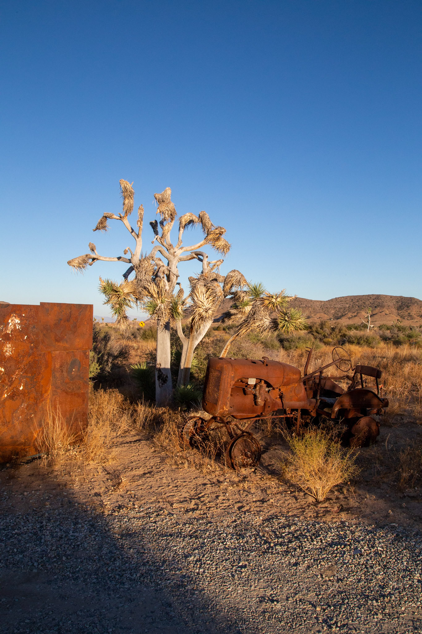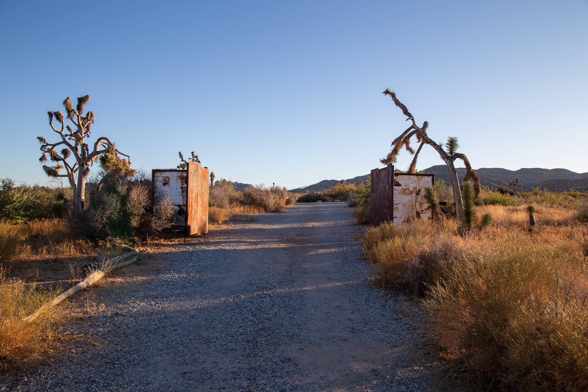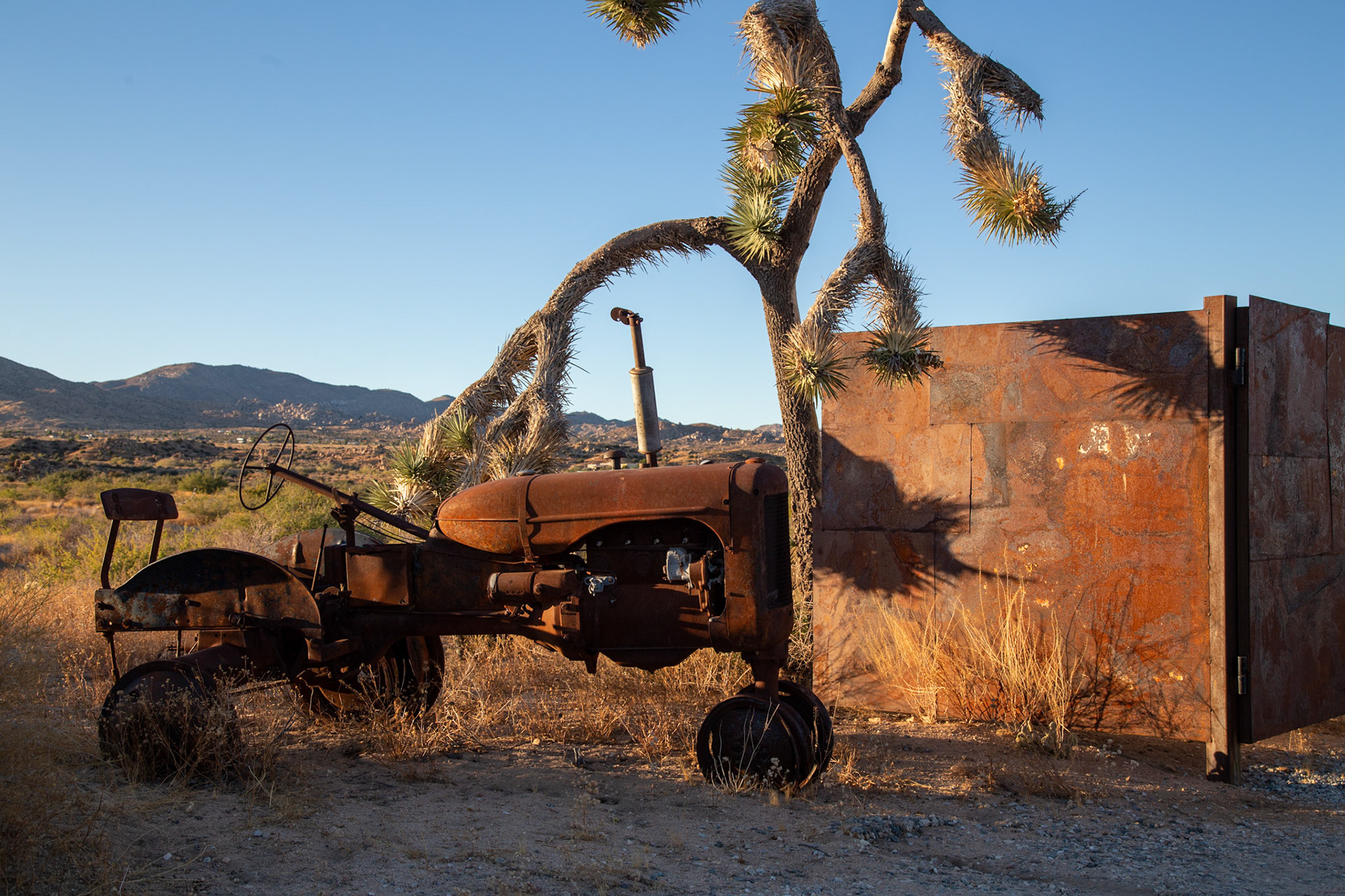 At the entry to our Airbnb in Pioneertown: flanked by two old tractors and large iron gate