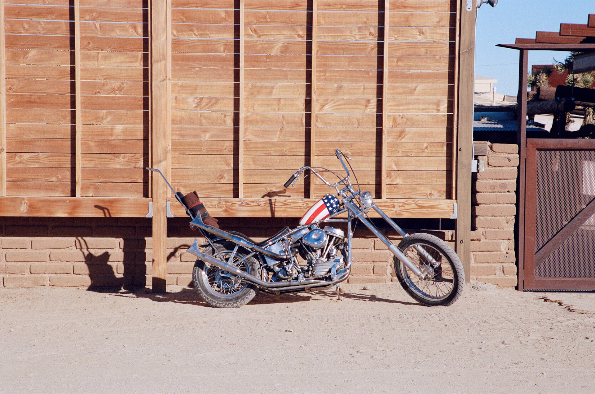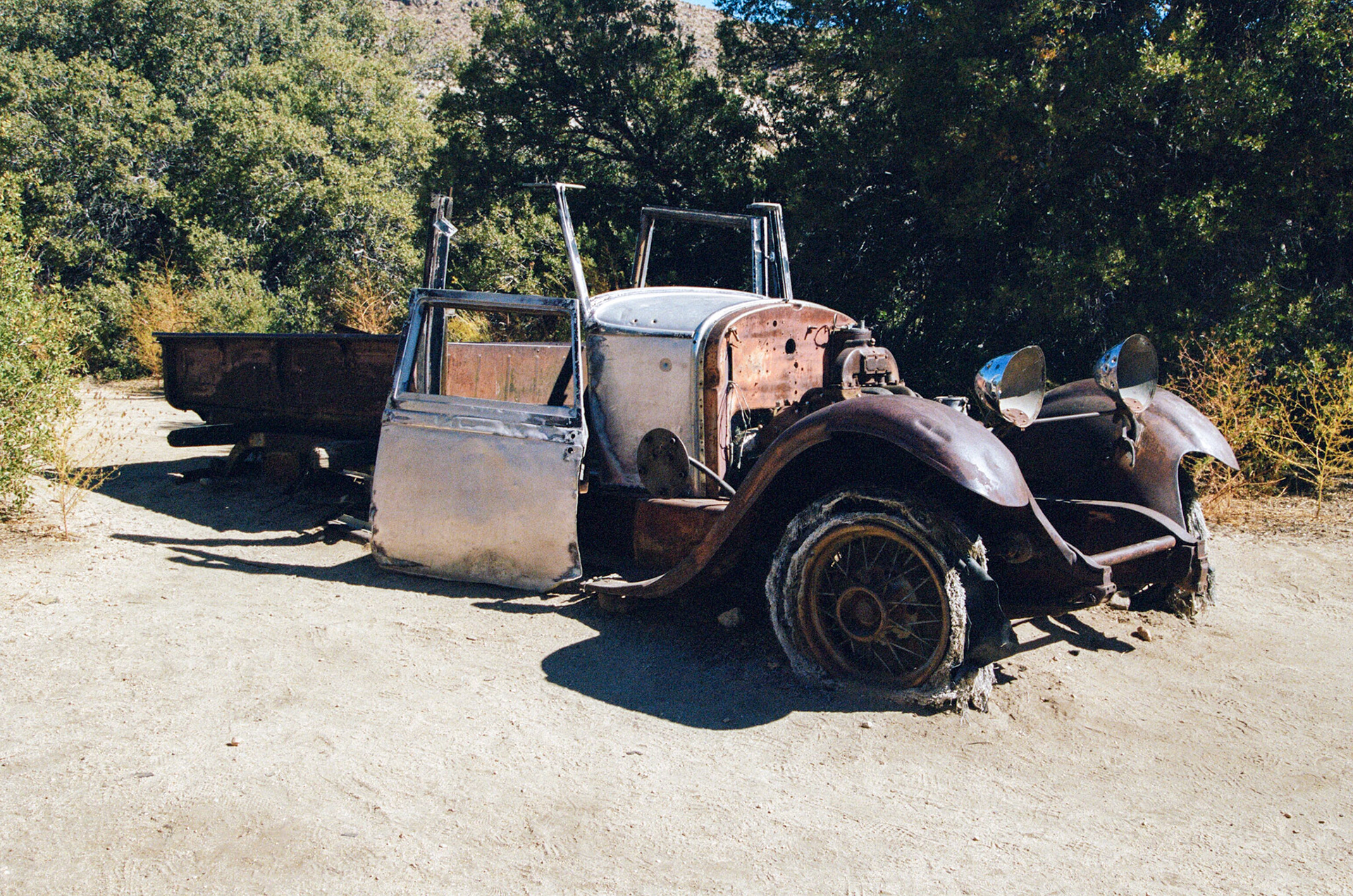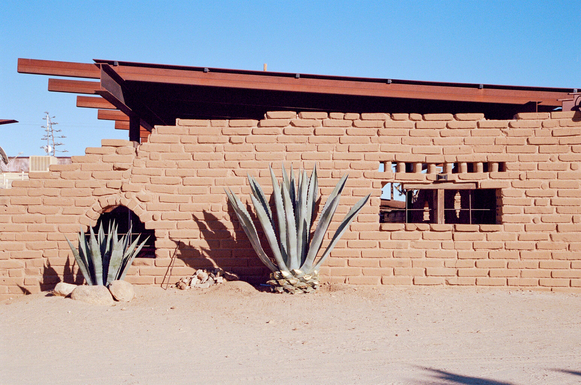At the entry to our Airbnb in Pioneertown: flanked by two old tractors and large iron gate